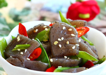 原料:魔芋、蘋果醋、鹽、荷蘭豆、蔥、紅辣椒、橄欖油、熟白芝麻。