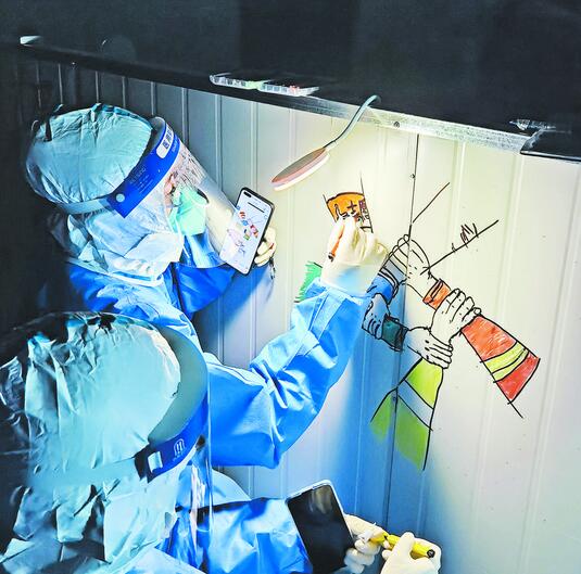 “大白”們借微弱燈光手繪漫畫(huà)。 昨天,浙江省醫(yī)療隊(duì)三隊(duì)隊(duì)員、浙大四院中醫(yī)專科護(hù)士劉青青正在方艙內(nèi)工作,突然一個(gè)小女孩跑到她面前,說(shuō):“姐姐,你們的畫(huà)畫(huà)得真好,我們一起加油,打敗病毒!” 原來(lái),幾天前某個(gè)夜晚,劉青青在與患者聊天時(shí),遇到一位媽媽帶著兩個(gè)女兒在畫(huà)畫(huà)。這位媽媽說(shuō):“馬上就要出院了,很感激浙江‘大白’們把方艙環(huán)境營(yíng)造得這么好,女兒要畫(huà)一幅畫(huà)像送給‘大白’。” 劉青青在感動(dòng)之余,想到母子三人出院后,仍然要面臨感染風(fēng)險(xiǎn),因此在出院之前必須跟她們?cè)俅螐?qiáng)調(diào)做好自我防護(hù)。但是她看著方艙內(nèi)的幾百號(hào)病人,就思考如何能在短時(shí)間內(nèi)以生動(dòng)的形式將自我防護(hù)知識(shí)傳遞給大家。后來(lái)她跟幾位同事想出了一個(gè)辦法,等到了夜深人靜之時(shí),他們拿出早就準(zhǔn)備好的彩色馬克筆,在患者必經(jīng)的通道隔板上畫(huà)起了健康宣教漫畫(huà)。 熄燈后整個(gè)方艙內(nèi)漆黑一片,有同事找來(lái)了一盞小臺(tái)燈,夾在隔板上方,大家就利用這一點(diǎn)光亮繼續(xù)作畫(huà)。除了健康宣教,大家還突發(fā)奇想,畫(huà)了一些正能量圖案,例如“同一個(gè)上海、同一個(gè)家園”“浙江醫(yī)療隊(duì)群像”“五方攜手共同抗疫”等。 方艙內(nèi)基本上是輕癥病人,醫(yī)療隊(duì)在日常護(hù)理中更多的是處理患者的心理問(wèn)題。有一位患者進(jìn)入方艙之后,面臨與家人分離以及其他一些心理問(wèn)題,心生恐懼,十分焦慮,導(dǎo)致情緒非常低落。劉青青與同事們輪流跟他聊天,緩解他的情緒。劉青青說(shuō):“畫(huà)漫畫(huà)除了進(jìn)行健康宣教、傳遞正能量,其實(shí)也是給隊(duì)員們自我加油和打氣!贝送猓瑒⑶嗲噙利用自己中醫(yī)護(hù)士的專業(yè)特長(zhǎng),錄制了《耳穴操》等科普視頻,讓大家學(xué)習(xí)一些簡(jiǎn)單的中醫(yī)保健知識(shí),增強(qiáng)體質(zhì)。 并肩作戰(zhàn)過(guò)程中,劉青青的工作動(dòng)力還有很大一部分來(lái)自隊(duì)友。劉青青說(shuō),她所在的小組里,有兩位十分幽默的男生,他們不僅在出發(fā)之前就主動(dòng)與大家取得聯(lián)系,還時(shí)常打趣說(shuō),“咱們都是一起‘扛過(guò)槍’的戰(zhàn)友了,以后有什么困難跟我說(shuō)”。于是,大家每次見(jiàn)面打招呼,都親熱地互稱“戰(zhàn)友”。 “大后方也給我們輸送了源源不斷的溫暖,每次忙完工作回到住處,我們都會(huì)發(fā)現(xiàn),房間柜子、冰箱被塞滿各種零食!眲⑶嗲嗾f(shuō),他們能夠去照顧那些急需照顧的人,本身就有很大成就感。再加上地方領(lǐng)導(dǎo)、醫(yī)院領(lǐng)導(dǎo)經(jīng)常關(guān)切地詢問(wèn)他們有沒(méi)有什么需要、有沒(méi)有什么難處,這些都讓他們感覺(jué)很幸福。劉青青與隊(duì)友們也把零食、“小確幸”分享給方艙的患者們,還告訴他們:你,不是一個(gè)人在抗疫! |