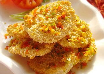 原料:蓮藕、去皮白芝麻、面粉、淀粉、彩椒、泡打粉少許、植物油 調料:鹽、雞精 做法: 1、彩椒切碎,蓮藕去皮,切片,放入開水中焯一下,將焯好的藕片快速放入涼水中過涼,瀝干水分備用。 2、以面粉2勺淀粉3勺的比例,加入適量清水、泡打粉少許和鹽,調成面糊。 3、將藕片均勻的沾上面糊,再裹上白芝麻,放入油鍋中炸至芝麻金黃,撈出備用。 4、鍋中留少許植物油,放入彩椒碎煸炒,煸至彩椒沒有水分時將炸好的藕片翻放入鍋中,加鹽和雞精,快速拌炒均勻即可。 |