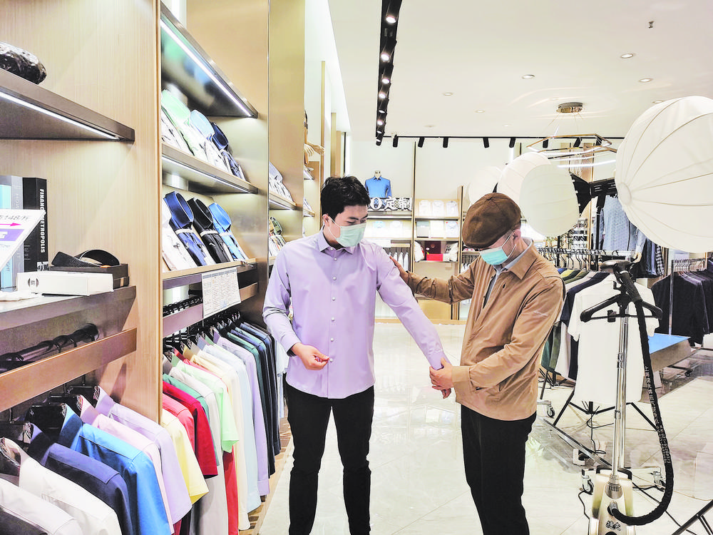 邊參觀現(xiàn)代化工廠,邊購(gòu)買(mǎi)熱門(mén)產(chǎn)品,如今,“工廠旅游”漸漸走進(jìn)人們生活。大陳鎮(zhèn)有“中國(guó)襯衫之鄉(xiāng)”美譽(yù),近年來(lái),“工廠旅游”在大陳鎮(zhèn)興起,一些襯衫企業(yè)內(nèi)部?jī)?yōu)化流程,方便顧客參觀,外部打造精美展廳,供顧客現(xiàn)場(chǎng)選購(gòu)。 昨日,市民龔先生在商捷服飾展廳選購(gòu)衣服。 |