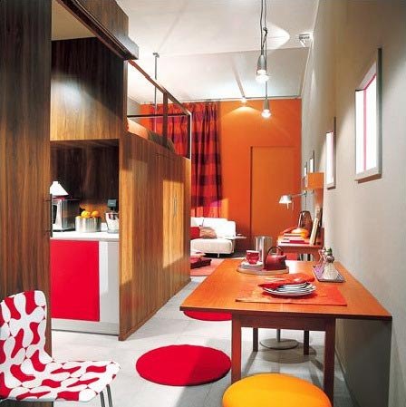 在這個層高4.3米的空間里,視覺重心被安排在了起居室,從起居室上樓梯,就可以看到高為1.8的二層閣樓臥室,一層書桌和餐桌旁,則是廚房和更衣間。整個空間分隔,甚至樓梯均為木質框架,這種原木質地和紋路,用在小空間會讓人更加舒適。