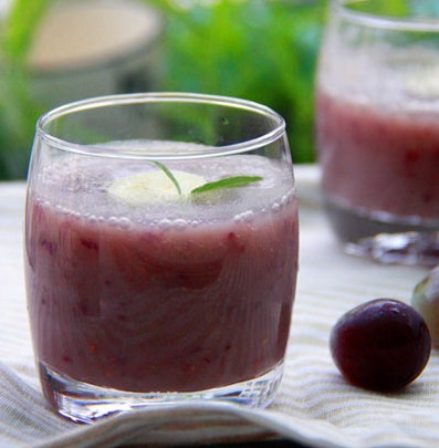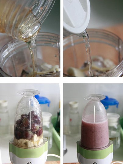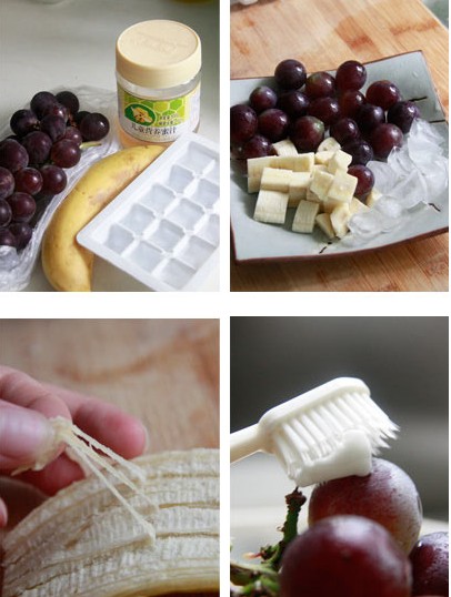 原料:葡糖、蜂蜜、香蕉、冰塊。 做法: 1、葡糖、蜂蜜、香蕉、冰塊; 2、將葡萄徹底洗干凈,可用牙刷蘸牙膏刷洗; 3、香蕉皮上經(jīng)絡(luò)不要扔掉,營養(yǎng)很豐富; 4、將葡萄香蕉冰塊放入攪拌機(jī)里,再加入大概一般水果的量的水。加上一大勺蜂蜜; 5、反復(fù)攪拌至葡萄核變成粉末妝,即可食用。不喜歡吃核的,可以過濾成果汁食用。