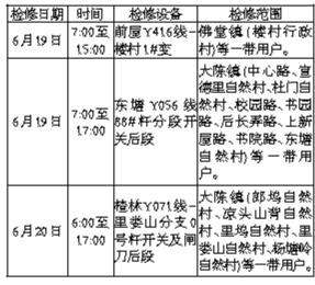 根據(jù)國網(wǎng)義烏市供電公司生產(chǎn)計劃檢修安排,定于6月19日-6月20日期間進行電力設備檢修,現(xiàn)將電力設備檢修影響客戶區(qū)域范圍列表公告如下,若遇雨天、雷暴等惡劣天氣檢修工作取消,工作期間會對正常供電造成影響,請各相關用戶諒解并做好生產(chǎn)安排,如有疑問,請咨詢電力服務電話:0579-85518551。