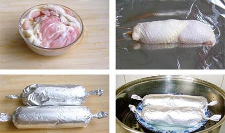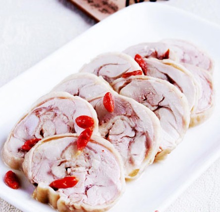 原料:雞腿2只、鹽、料酒、當(dāng)歸3克、枸杞一大勺、花雕酒。 做法: 1、雞腿剔除腿骨,撒鹽倒少許料酒,涂抹均勻后,腌制半小時; 2、卷一個緊實的卷,用錫箔紙包裹緊,擰上兩頭,上鍋蒸30分鐘; 3、蒸的時候做汁,3克當(dāng)歸、枸杞30粒,用400ml水煮10分鐘,倒入容器中放入蒸好的雞腿卷,倒200ml紹興酒,浸泡6個小時以上,切片即可開食。