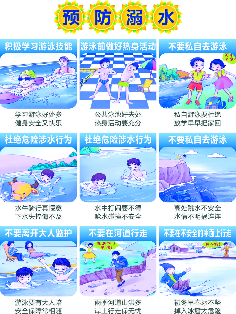 安全游泳要點(diǎn) •不要獨(dú)自一人外出游泳,更不要到不摸底和不知水情或比較危險(xiǎn)且宜發(fā)生溺水傷亡事故的地方去游泳。選擇好的游泳場(chǎng)所,對(duì)場(chǎng)所的環(huán)境,如該水庫(kù)、浴場(chǎng)是否衛(wèi)生,水下是否平坦,有無(wú)暗礁、暗流、雜草,水域的深淺等情況要了解清楚。 •必須要有組織并在老師或熟悉水性的人的帶領(lǐng)下去游泳。以便互相照顧。如果集體組織外出游泳,下水前后都要清點(diǎn)人數(shù)、并指定救生員做安全保護(hù)。 •要清楚自己的身體健康狀況,平時(shí)四肢就容易抽筋者不宜參加游泳或不要到深水區(qū)游泳。要做好下水前的準(zhǔn)備,先活動(dòng)活動(dòng)身體,如水溫太低應(yīng)先在淺水處用水淋洗身體,待適應(yīng)水溫后再下水游泳;鑲有假牙的同學(xué),應(yīng)將假牙取下,以防嗆水時(shí)假牙落入食管或氣管。 •對(duì)自己的水性要有自知之明,下水后不能逞能,不要貿(mào)然跳水和潛泳,更不能互相打鬧,以免喝水和溺水。不要在急流和漩渦處游泳,更不要酒后游泳。 •在游泳中如果突然覺(jué)得身體不舒服,如眩暈、惡心、心慌、氣短等,要立即上岸休息或呼救。 •在游泳中,若小腿或腳部抽筋,千萬(wàn)不要驚慌,可用力蹬腿或做跳躍動(dòng)作,或用力按摩、拉扯抽筋部位,同時(shí)呼叫同伴救助。 •在游泳中遇到溺水事故時(shí),現(xiàn)場(chǎng)急救刻不容緩,心肺復(fù)蘇最為重要。將溺水者救上岸后,要立即清除口腔、鼻咽腔的嘔吐物和泥沙等雜物,保持呼吸通暢;應(yīng)將其舌頭拉出,以免后翻堵塞呼吸道;將溺水者的腹部墊高,使胸及頭部下垂,或抱其雙腿將腹部放在急救者肩部,做走動(dòng)或跳動(dòng)“倒水”動(dòng)作。恢復(fù)溺水者呼吸是急救成敗的關(guān)鍵,應(yīng)立即進(jìn)行人工呼吸,可采取口對(duì)口或口對(duì)鼻的人工呼吸方式,在急救的同時(shí)應(yīng)迅速送往醫(yī)院救治。 游泳十忌 •忌空腹游泳 •忌劇烈運(yùn)動(dòng)后游泳 •忌酒后游泳 •忌飯后游泳 •忌月經(jīng)期間游泳 •忌在不熟悉的水域游泳 •忌游泳后馬上進(jìn)食 •忌不做準(zhǔn)備活動(dòng)游泳 •忌游時(shí)過(guò)長(zhǎng) •忌忽視游后衛(wèi)生 |