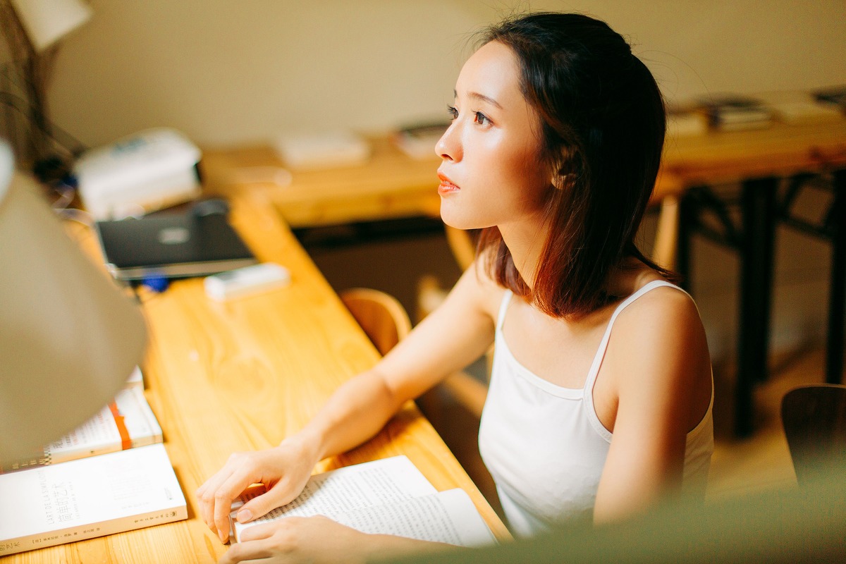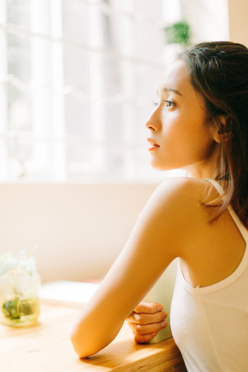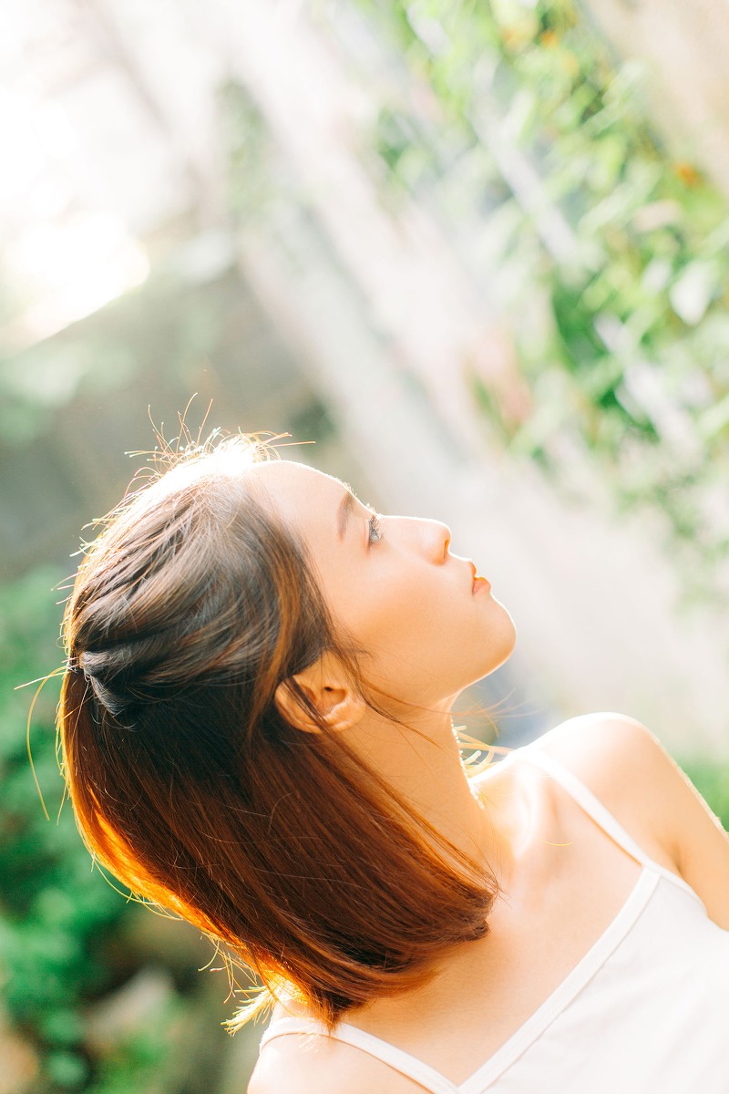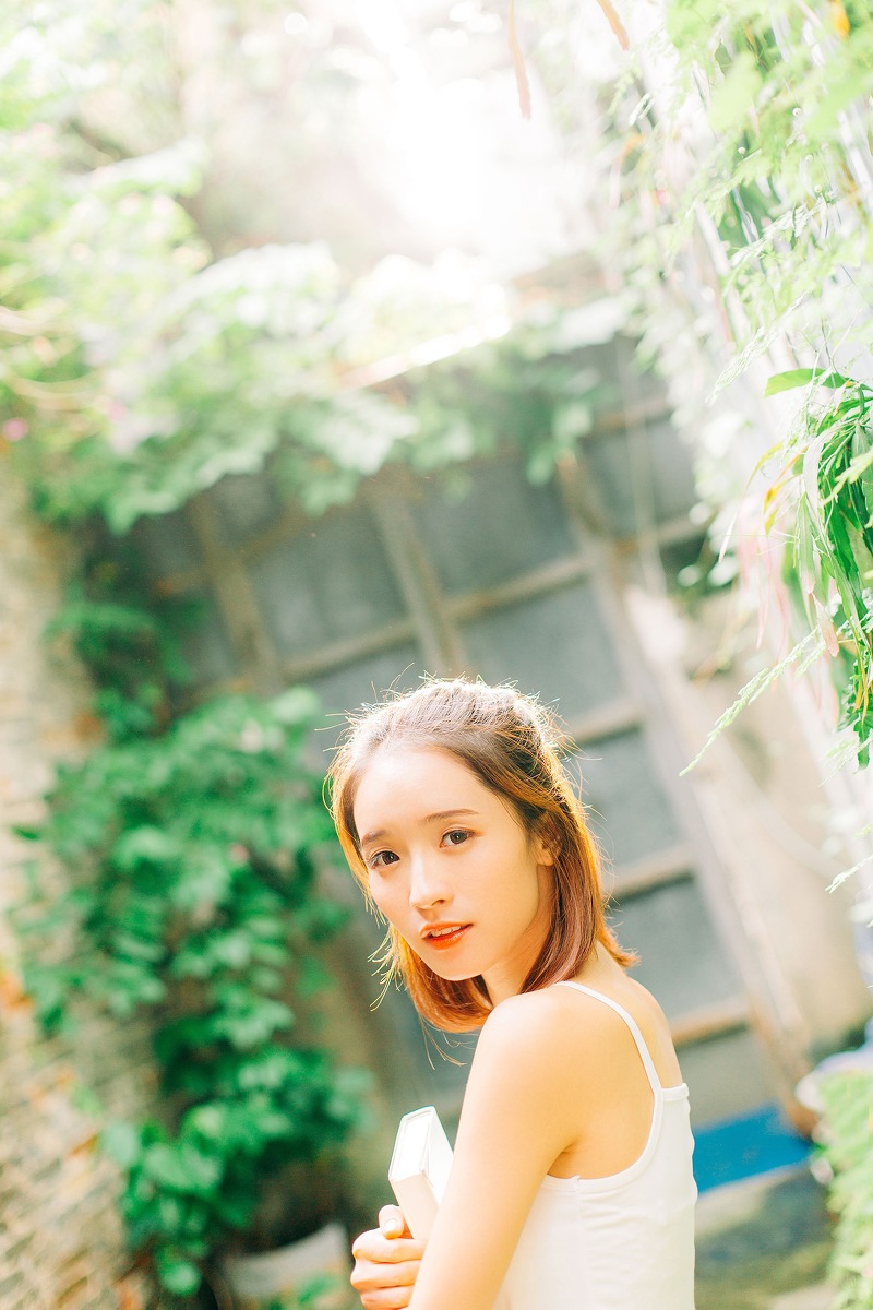 短發(fā)皮膚干凈白色吊帶T恤美女的夏天
