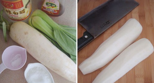 白蘿卜1根、白醋3湯匙、白糖2湯匙、蜂蜜1湯匙半、鹽1茶匙、上海青1棵。