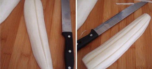 3、取蘿卜中間,然后斜刀切一刀,直刀切一刀,切成月芽形,用刀取出切斷的蘿卜條;