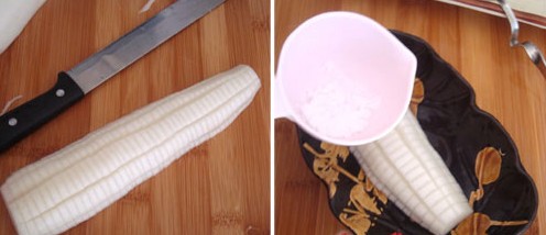 2、白蘿卜去皮洗凈,切去頭尾,切成兩瓣;