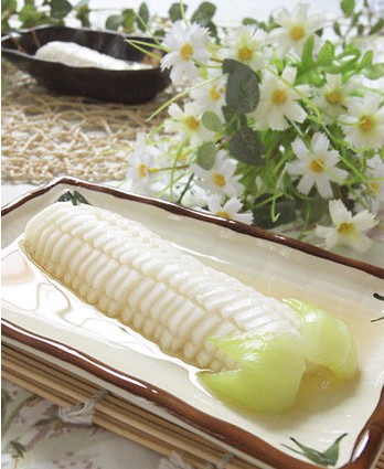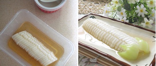 10、將腌好的蘿卜和上海青葉片擺成玉米狀即可。