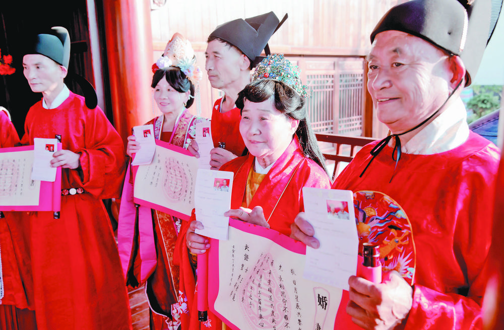 婚車巡游,披紅掛彩,滿載喜慶,美景佳偶。當(dāng)天下午4時(shí)許,一場(chǎng)簡(jiǎn)約而不簡(jiǎn)單,莊重而不失浪漫的集體頒證儀式,在千年古鎮(zhèn)緩緩拉開序幕。紙婚、木婚、錫婚、銀婚、金婚……10對(duì)不同婚齡的夫妻撐著油紙傘,攜手漫步在愛情碼頭,同登愛的彼岸。熱鬧喜慶的“婚車”沿著古鎮(zhèn)河道行駛,引得岸上游客駐足觀看。一幕幕畫面定格,水街以晝景調(diào)墨,以喜色落款,在水光詩(shī)意和鑼鼓聲中,將古鎮(zhèn)婚典完美演繹。 在蒲川水街的老戲臺(tái)上,參與活動(dòng)的夫妻在司儀的引導(dǎo)下,依次行洗塵之禮、登堂之禮、三拜儀式之禮等,市民政局、佛堂鎮(zhèn)為參與活動(dòng)的夫妻頒發(fā)結(jié)婚證以及定制的傳統(tǒng)中式婚書,10對(duì)老夫老妻重新領(lǐng)證。 形式多樣而富有儀式感的頒證儀式,帶給“再次”領(lǐng)到結(jié)婚證的夫妻們,不一樣的登記體驗(yàn),他們的臉上始終洋溢著幸福的笑容。葉新榮和王秋蓮是參加集體頒證儀式的一對(duì)金婚夫婦,為了參加這次活動(dòng),夫妻倆早早就過來化妝彩排了!敖裉焓莻(gè)意義非凡的日子,特別感謝民政部門為我們舉辦這樣一個(gè)美好的儀式,我會(huì)一輩子記在心中!蓖跚锷徴f,這樣領(lǐng)證儀式感滿滿,給他們留下珍貴的回憶。 據(jù)了解,自婚俗改革以來,市民政局創(chuàng)新開展結(jié)婚登記頒證服務(wù),加強(qiáng)頒證場(chǎng)所建設(shè),創(chuàng)設(shè)室內(nèi)室外頒證場(chǎng)所,設(shè)計(jì)文化內(nèi)涵豐富的頒證詞,組織舉辦集體婚禮、紀(jì)念婚禮等特色突出、文明節(jié)儉的創(chuàng)意婚禮,倡導(dǎo)和推廣體現(xiàn)優(yōu)秀中華文化的傳統(tǒng)婚禮,尊重婚俗禮儀的多樣性,使中華優(yōu)秀婚俗禮儀薪火相傳,為增強(qiáng)文化自信提供優(yōu)質(zhì)載體。 “佛堂鎮(zhèn)素有千年古鎮(zhèn)、清風(fēng)商埠、佛教圣地的美譽(yù),被評(píng)為中國(guó)歷史文化名鎮(zhèn),這次傳統(tǒng)的中式集體婚禮,將中國(guó)傳統(tǒng)建筑的美和中國(guó)傳統(tǒng)婚俗的美相結(jié)合,為大家呈現(xiàn)了婚姻從一年紙婚到五十年金婚的美好!狈鹛面(zhèn)社會(huì)事務(wù)服務(wù)管理辦公室負(fù)責(zé)人胡塵說,佛堂作為全市集中補(bǔ)證的試點(diǎn)鎮(zhèn)街,自5月24日開展集中補(bǔ)領(lǐng)婚姻登記證試點(diǎn)工作,通過分村精準(zhǔn)動(dòng)員、免費(fèi)紀(jì)念留影等形式,截至目前已完成4300余對(duì)夫妻換證,同時(shí)也希望通過這次活動(dòng),讓全社會(huì)更加關(guān)注家庭、關(guān)注家教、關(guān)注家風(fēng),讓“好家風(fēng)、好家教”深入更多家庭。 |
