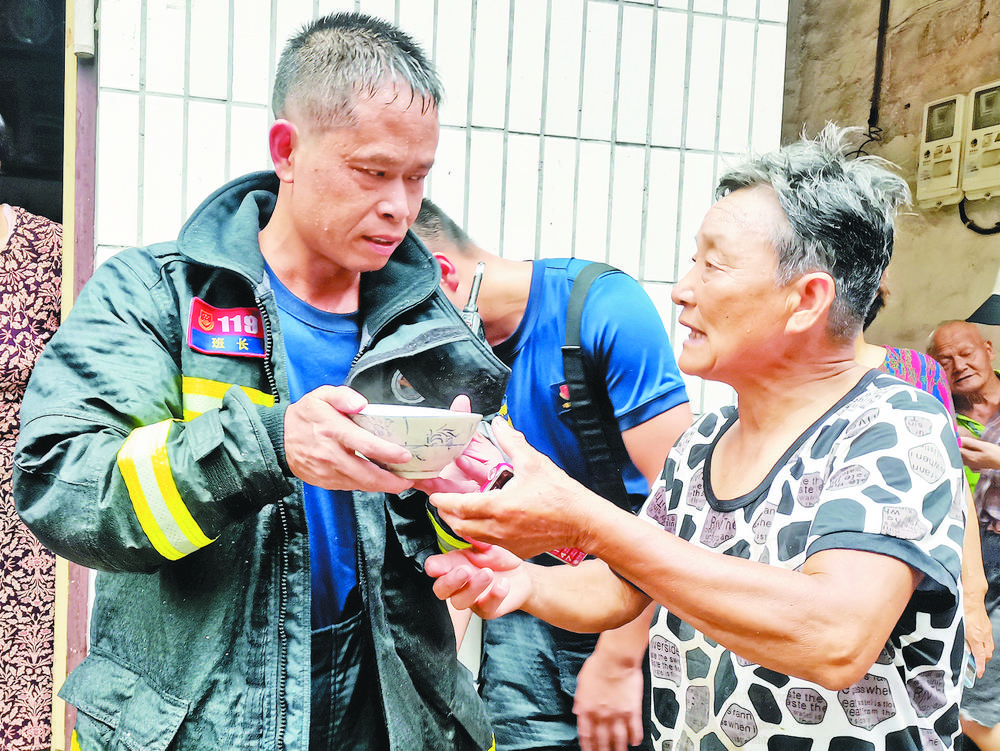 老奶奶催著消防員喝下淡鹽水。 “來,把這碗鹽水喝掉,這是老方法,消暑很管用!”7月18日,消防救援人員朱有富在火場滅火時中暑了,被轉(zhuǎn)移到后方后,一位老人送上一碗冒著熱氣的淡鹽水,讓他的心里充滿感激。 當(dāng)天下午1時45分許,赤岸鎮(zhèn)專職消防隊接到市消防救援支隊119指揮中心的指令,轄區(qū)東朱村一處老房子起火,專職消防隊要立即出動救援力量前往處置。據(jù)悉,著火的是木質(zhì)結(jié)構(gòu)老房子,邊上就是老人聚集的老年協(xié)會,決不能讓火勢蔓延,消防員迅速展開滅火救援工作。 三伏天,氣溫直逼40℃,再加上火場高溫,這對身穿厚重滅火戰(zhàn)斗服、背著空氣呼吸器的消防員來說,是一個嚴峻的考驗。明火撲滅后,朱有富和另一名隊員突然出現(xiàn)中暑癥狀,現(xiàn)場指揮員立即命令二人到后方休息,后方保障人員馬上給他們拿來了解暑藥和水。 此時,老年協(xié)會中的老人們自發(fā)地為消防救援人員送去了各種解暑“良方”:有的拿來扇子為消防員扇風(fēng)驅(qū)暑,有的給消防員揪痧祛暑,還有一位70多歲的老奶奶跑回家端來兩碗淡鹽水。老奶奶說,這是民間消暑的土法子,在溫開水里加一點鹽,喝了能補鹽分解暑。她一邊說著,一邊“盯”著中暑的消防救援人員“乖乖”喝完。 由于撲救及時,火情并未釀成火災(zāi),全身被汗水濕透的消防救援人員終于長舒了一口氣,而高溫下的那份“魚水深情”,更加讓他們刻骨銘心。 |