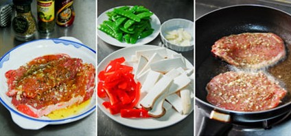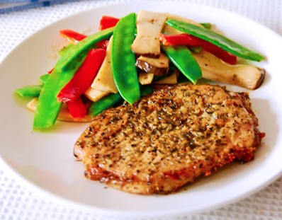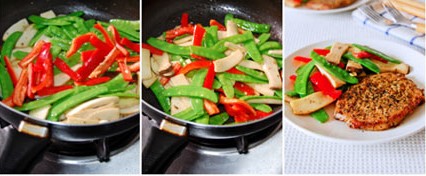 原料:2人份 豬排2片。 腌豬排調(diào)味料:大蒜2瓣、意大利綜合香草1大勺、干燥巴西利1/4小勺、豆蔻粉少許、黑胡椒碎1/4小勺、豆蔻粉少許、鹽1/2小勺、橄欖油1大勺。 蔬菜配料:大蒜2瓣、杏鮑菇1-2個(gè)、荷蘭豆150克、紅甜椒1個(gè)、白葡萄酒、鹽及黑胡椒粉各適量。 做法: 1、將所有腌豬排調(diào)味料及蒜末加入豬排中混合均勻放入冰箱冷藏4小時(shí)以上入味; 2、吃之前先將腌好的豬排從冰箱取出回溫,再來(lái)準(zhǔn)備蔬菜的配料:荷蘭豆入沸水汆燙一下,大蒜切薄片、紅甜椒切條、杏苞菇切片備用; 3-4、平底鍋燒熱倒入2勺食用油,將豬排放入用中小火煎至全熟盛起; 5、將配菜的蒜片倒入原鍋中炒香; 6、接著把杏苞菇放入翻炒變軟,倒入白葡萄酒烹香; 7-8、再將甜椒和汆燙過(guò)的荷蘭豆放入翻炒一會(huì),加入鹽和黑胡椒調(diào)味炒勻即可; 9、蔬菜搭配香草豬排一起享用吧。
