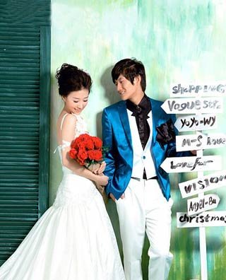 給人感覺浪漫的一張婚照,新郎黑色襯衫配白色馬甲的藍色休閑禮服搭配白色褲子,很顯紳士的風度。新娘身著白色花紋式的婚紗,將新娘襯托的更加的嬌小動人,新娘手上的紅色玫瑰手捧花也讓這組婚照具有濃濃的浪漫味道。