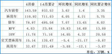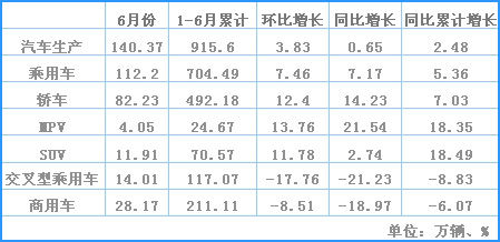 上半年,汽車?yán)塾嫯a(chǎn)銷915.60萬輛和932.52萬輛,同比增長2.48%和3.35%。其中:乘用車產(chǎn)銷704.49萬輛和711.03萬輛,同比增長5.36%和5.75%;商用車產(chǎn)銷211.11萬輛和221.49萬輛,同比下降6.07%和3.67%。 |