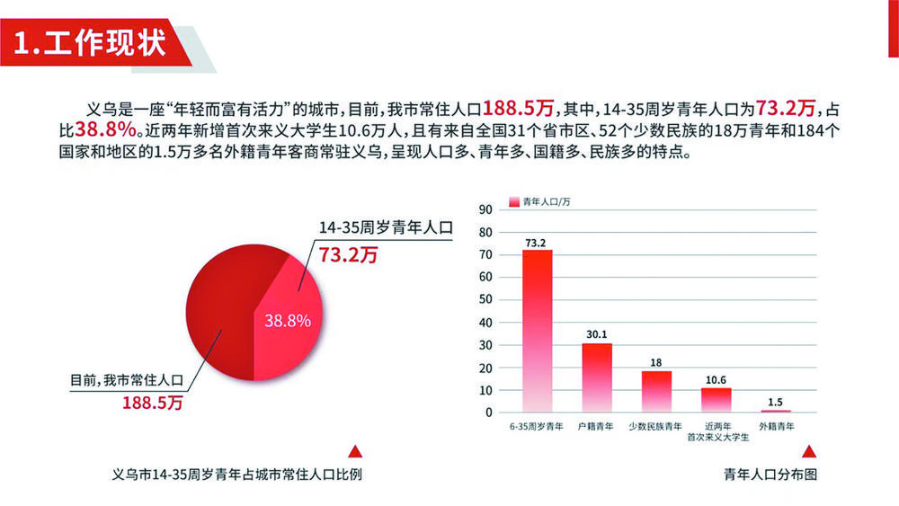 贏得青年才能贏得未來,塑造青年才能塑造未來。義烏對于青年人才的渴望,有增無減。近年來,圍繞青年發(fā)展,我市不斷提升城市對優(yōu)秀青年的吸納力、吸引力。今年6月,義烏入選全國青年發(fā)展型縣域試點。根據(jù)《義烏市青年發(fā)展型縣域試點方案》,我市提出“義青春”十大工程28項舉措,推出“三清單 一報表”強化責任落實,奮力打造“青春義烏 眾創(chuàng)之都”青年發(fā)展友好型城市金名片。 青年興,讓義烏更“年輕” 對于人來說,年輕人無疑是最具發(fā)展?jié)摿Φ,對于城市也是一樣,更“年輕”的城市,往往被認為更具有發(fā)展?jié)摿ΑAx烏就是一座“年輕”的城市。自改革開放以來,義烏的發(fā)展十分驚人,從名不見經(jīng)傳的小縣城一舉成為世界小商品之都,創(chuàng)造了“義烏速度”。城市的發(fā)展離不開人,讓城市不斷更新、更多人口流入、年輕人的比例這3大因素是義烏保持年輕的秘訣。 根據(jù)第七次全國人口普查數(shù)據(jù)顯示,義烏青年常住人口為73.23萬人,占常住人口188.5萬的38.8%,與2010年第六次人口普查相比,青年常住人口增加19.9萬人,大量外地青年、外籍青年集聚義烏,組成別樣“百家姓”。“十三五”期間,共招引13萬名高校畢業(yè)生來義就業(yè)創(chuàng)業(yè),義烏人才總量從21.45萬人增至34.5萬人,專業(yè)技術(shù)人才從8.14萬人增至10.6萬人。 青年人才不斷流入,為義烏聚力發(fā)展增添了更深厚的內(nèi)生動力。廣大青年積極參與我市政治、經(jīng)濟、文化、社會與生態(tài)文明建設(shè),深度參與東西部扶貧協(xié)作、對口支援、對口合作。開展“一村一青年委員”工作,高質(zhì)量選育685名青年進入村社兩委班子,助力鄉(xiāng)村振興;廣泛開展“法小青”“河小青”“跑小青”工作品牌,為青年參與社會基層治理搭建平臺;志愿服務(wù)工作得到長足進步,實名注冊志愿者已達25萬余人,志愿組織數(shù)量2163個,近5年累計提供志愿服務(wù)約753萬小時。此外,在人大代表、政協(xié)委員中,青年人數(shù)多達65名,他們代表青年群體為義烏發(fā)展獻計獻策。 青年夢,由義烏來守護 吸引青年人才、留住青年人才,是一座城市的潛力所在、未來所在。義烏為廣大青年實現(xiàn)人生出彩搭建了廣闊舞臺。不管是在象牙塔里暢想未來的莘莘學子,還是在美麗鄉(xiāng)村揮灑汗水的青年委員;無論是在寫字樓中伏案工作的年輕白領(lǐng),還是在大街小巷穿行不息的快遞小哥,在義烏,總能打拼出一方屬于自己的天地。 在后宅街道李祖村有這樣一群年輕人,似燕子歸巢般來到這里創(chuàng)業(yè),把扎染、造紙、銅器等傳統(tǒng)手作帶到農(nóng)村,他們的朝氣讓這里越來越年輕化,美麗鄉(xiāng)村建設(shè)也成了大家心中的詩和遠方。 來自湖南的劉歡是中南大學湘雅醫(yī)學院本碩博連讀的畢業(yè)生,曾在美國比茲堡大學交換3年。2019年,義烏優(yōu)越的人才引進政策吸引了他來到浙大四院,成為一名神經(jīng)內(nèi)科醫(yī)生,如今一家三口在義烏安了家。 作為土生土長的義烏人,虞晨航大學畢業(yè)后回到家鄉(xiāng)創(chuàng)業(yè),經(jīng)過團市委請來的專家進行授課培訓,成功把線下實體和線上流量相結(jié)合,順利完成轉(zhuǎn)型升級。 “90后”吳燕原本是一名銀行職員,得知四季社區(qū)需要青年力量加入后,她義無反顧辭職“轉(zhuǎn)行”,成為北苑街道的一名青年委員,組織成立四季紅領(lǐng)青年志愿服務(wù)隊,為社區(qū)的疫情防控、安全生產(chǎn)、文明創(chuàng)建、防詐宣傳等注入強大的青年力量……來自世界各地的人們匯聚在義烏,不同的文化和青春也匯聚在這里,分享著屬于自己的青春故事。 一個個青春奮斗的故事都離不開義烏精心打造的青年成長成才平臺和一攬子保障政策。“十三五”期間,義烏立足市場優(yōu)勢,緊跟全球電子商務(wù)發(fā)展趨勢,準確把握商貿(mào)服務(wù)業(yè)發(fā)展重要機遇,及時出臺相關(guān)產(chǎn)業(yè)發(fā)展配套政策,加快基礎(chǔ)設(shè)施建設(shè),引導青年在電商直播、物流快遞等新興行業(yè)集聚發(fā)展,市場主體突破80萬戶,不斷吸引全國乃至全世界青年來義創(chuàng)業(yè)發(fā)展;大力推進“教育倍增計劃”“雙百園工程”等,增加學位供給,新增學校建設(shè)面積75萬平方米;完善青年就業(yè)創(chuàng)業(yè)支持舉措,加強青年就業(yè)服務(wù),為青年職業(yè)發(fā)展提供新助力;加快完善以公租房、保障性租賃住房和共有產(chǎn)權(quán)住房為主體的住房保障體系,促進解決新市民、青年等群體的住房困難。2014年以來,累計發(fā)放購房補貼10.82億元,惠及3000余人;深化“親青”服務(wù)工作品牌,常態(tài)化舉辦創(chuàng)業(yè)培訓、求職招聘、婚戀交友等活動;定期舉辦“義烏文化藝術(shù)節(jié)”“義烏馬拉松”等文體活動,不斷豐富充實青年業(yè)余生活,提升青年生活幸福感。 義烏正不斷為青年搭建起廣闊的舞臺,助力他們舞出絢麗青春。我們堅信,經(jīng)過全社會的不懈努力,青年發(fā)展的美好藍圖一定能夠變?yōu)楝F(xiàn)實。義烏青年繼承傳統(tǒng)、不忘初心,砥礪奮斗、繼續(xù)前進,以數(shù)字化改革鍛造高質(zhì)量發(fā)展建設(shè)共同富裕示范區(qū)成功案例,為高質(zhì)量高水平建成世界小商品之都貢獻青春智慧