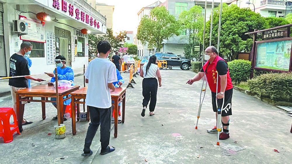 沈永強拄著拐杖堅守在核酸檢測點 8月3日早上5點,天剛蒙蒙亮,在上溪鎮(zhèn)溪田村核酸檢測點,陸陸續(xù)續(xù)有村民前來進行核酸采樣。遠遠地,村民們就能看到一個身著紅馬甲、拄著拐杖的身影。 “錯開點,保持距離!贝呓豢,原來是村黨支部書記沈永強,他左腿腳踝打著厚厚的石膏,拄著雙拐站在一旁,一遍又一遍地叮囑村民戴好口罩,保持安全距離。有村民忍不住打起招呼:“沈書記,你坐下歇會兒吧! “不小心扭了一下,不要緊的!贝迕裨儐柲_傷時,他總是這樣說。原來,7月16日,沈永強帶領(lǐng)村兩委在大清查(排查有安徽省蚌埠市旅居史的來義返義人員)過程中,在臺階上不慎扭傷,導(dǎo)致骨折,醫(yī)生叮囑他少走動,多休息。 沒想到,“8.2”疫情來勢洶洶。8月2日當晚,村兩委所有干部都去增援江東街道,第二天收到要開展全域核酸檢測的消息時,村兩委只剩下沈永強一人。作為村社“一肩挑”,他強忍著疼痛連夜起床,開始組織布置村內(nèi)核酸檢測現(xiàn)場、人員安排、疫情防控宣傳、村內(nèi)硬隔離等工作。 溪田村居住著許多外來人口,一整天的辛苦工作后,沈永強受傷的腳踝又開始發(fā)腫、充血,村民和志愿者們都勸他回家好好養(yǎng)傷,沈永強依舊堅持在核酸檢測點維持秩序!艾F(xiàn)在疫情形勢嚴峻,我不能置身事外!鄙蛴缽娬f。 |