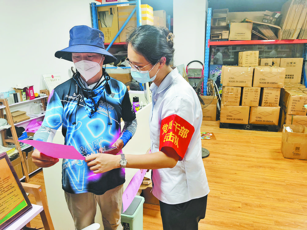 “老板,今天沒有特殊情況吧?口罩要戴牢,非必要不離義!8月7日上午,作為國際商貿城二區(qū)的經營戶,也是三級作戰(zhàn)單元的網格長,戴著“防疫執(zhí)勤”紅袖章的陳祥春開始了一天的工作。他先是走訪“管轄”的14個商戶,宣傳市里的最新疫情防控要求,并對人員聚集、不戴口罩等現象進行勸阻。 8月7日一早,商城集團國際生產資料市場分公司黨支部15名黨員下沉一線,向國際生產資料市場1474個經營戶宣傳疫情防控。 “疫情嚴峻,大家‘非必要不離義’,非必要、不流動、不串門!秉h員吳倩雯走進“海客來”攤位,向經營戶王一鳴宣傳疫情防控相關要求!昂玫模覀兎浅@斫,一定做好,不添亂。”王一鳴說。 |