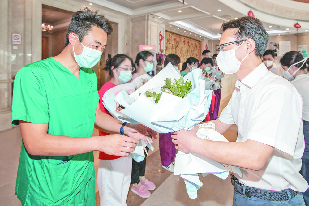 市委書記王健向援義醫(yī)療服務(wù)隊隊員贈送鮮 白衣執(zhí)甲護烏傷,山河無恙待君來;大義相助擔(dān)使命,感恩不忘援義情。昨日,來自全省各地的援義醫(yī)療服務(wù)隊開始陸續(xù)返程。我市各鎮(zhèn)街紛紛舉行援義醫(yī)療服務(wù)隊歡送儀式,熱情歡送援義抗疫英雄。 市四套班子領(lǐng)導(dǎo)分別在各自聯(lián)系鎮(zhèn)街參加歡送儀式,一一向援義醫(yī)療服務(wù)隊隊員贈送鮮花。 市委書記王健代表義烏市委市政府以及200多萬義烏人民,向全體援義醫(yī)療服務(wù)隊表示衷心的感謝并致以崇高的敬意。王健說,“8·2”疫情突如其來,這場疫情防控阻擊戰(zhàn)經(jīng)受了前所未有的嚴(yán)峻考驗。在省委省政府堅強領(lǐng)導(dǎo)、全省各地鼎力相助下,本輪疫情取得重大突破,實現(xiàn)“勝利在望”到“勝利在握”。在義烏疫情防控最關(guān)鍵、最艱難的時刻,援義醫(yī)療服務(wù)隊挺身而出、無私奉獻,是這場戰(zhàn)役中最靚麗的風(fēng)景線,為義烏抗疫勝利作出了突出貢獻。 危難時刻,白衣執(zhí)甲,逆行出征。炎炎夏日,來自杭州、嘉興、寧波、臺州、湖州、金華等全省各地醫(yī)院的7700多名醫(yī)務(wù)人員積極響應(yīng)省委省政府號召,請纓出戰(zhàn),馳援義烏,為義烏人民點亮希望之光。他們夜以繼日奮戰(zhàn)在抗疫主戰(zhàn)場,用血肉之軀筑起了護佑生命的鋼鐵長城,用實際行動詮釋了醫(yī)者仁心、大愛無疆的職業(yè)精神,充分展現(xiàn)了不懼危險、勇毅前行的英雄氣概,充分體現(xiàn)了一方有難、八方支援的濃濃情誼。 歡送儀式結(jié)束后,滿載援義醫(yī)療服務(wù)隊隊員的大巴車緩緩發(fā)車,他們帶著義烏人民的感謝踏上歸程。我市公安交警按照最高的標(biāo)準(zhǔn)、最高的禮儀,護送援義醫(yī)療服務(wù)隊隊員返程。 |