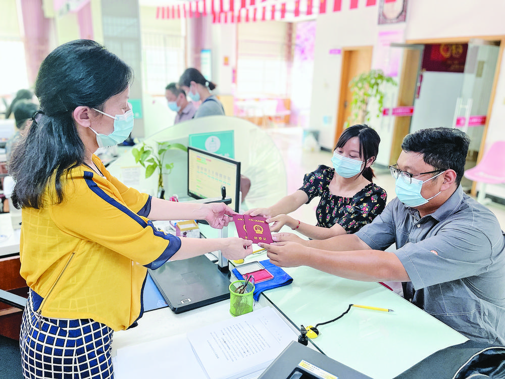 新人喜領結婚證 昨日,市婚姻登記中心恢復辦理婚姻登記業(yè)務,迎來婚姻登記業(yè)務辦理小高峰,僅上午半天就有22對市民前來辦理婚姻登記手續(xù)。當天上午,記者在市婚姻登記中心看到,前來辦理婚姻登記業(yè)務的市民都自覺佩戴口罩,依次掃場所碼,主動向工作人員出示健康碼和核酸采樣證明,待工作人員核查并測溫后,有序走進大廳辦理業(yè)務。 吳先生和章女士是眾多辦理婚姻登記業(yè)務中的一對新人,兩人預約好時間后提前半小時來到市婚姻登記中心,拿著事先準備好的結婚登記材料,前往窗口辦理業(yè)務。通過初審、受理、審查、登記等流程后,工作人員將結婚證遞到兩人手中,并為這對新人送上美好的新婚祝福。“我們原來計劃今年8月8日辦理結婚登記手續(xù),可沒想到,受疫情影響,婚姻登記中心暫停辦理業(yè)務,打亂了我們的計劃。我倆心里一直想著這件事,得知今天恢復辦理業(yè)務,就早早過來了!眳窍壬f。 市婚姻登記中心主任龔君婷介紹,恢復婚姻登記業(yè)務首日,盡管前來辦理業(yè)務的人不少,但現(xiàn)場忙而不亂。該中心一大早就對辦事大廳進行消毒,前來辦理業(yè)務的市民嚴格按照疫情防控要求進入大廳,自覺保持2米以上安全距離,不扎堆、不聚集。 據(jù)悉,為了避免人員聚集扎堆,減少婚姻登記場所人員滯留時間,婚姻登記中心按照“預約辦理、分時分段、錯峰登記”原則,嚴格落實各項疫情防控措施,統(tǒng)籌做好疫情防控與婚姻登記工作;橐龅怯洰斒氯颂崆2—30天通過“浙里辦”App或“義烏婚姻家庭”微信公眾號進行預約。原則上只辦理預約登記業(yè)務,非預約暫緩受理;橐龅怯洰斒氯税凑疹A約時間段到達,佩戴口罩,測量體溫,同時配合“一掃三查”(掃場所碼,查健康碼、行程卡、48小時核酸檢測陰性證明),符合條件的方可進入登記場所。 市婚姻登記中心提醒:因疫情防控暫停辦理婚姻登記期間(8月8日—19日)已成功預約離婚申請而未能受理的,受理時間憑預約成功短信可順延至8月31日。對于離婚冷靜期屆滿后三十日內未能辦理離婚登記業(yè)務的,可現(xiàn)場預約重新辦理離婚申請。疫情防控期間,非必要謝絕陪同人員進入婚姻登記場所。 |