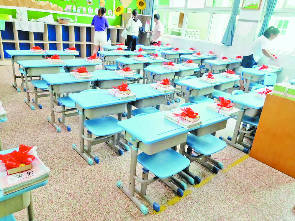 假期里,實驗小學開展了暑假德育特色實踐活動,強化學生體育鍛煉,增強美育熏陶,加強勞動教育。開學后,學生們會把自己在暑假里做的手工作品、繪畫作品、手抄報等帶到學校,扮靚教室。 “我們要用整潔的校園來迎接孩子們‘回家’!睂嶒炐W老師說,家長和孩子們都很熱心,打掃衛(wèi)生、分發(fā)書本、澆灌綠植、書寫黑板報,積極參加扮靚教室的活動。 8月30日,佛堂三小的老師們親手為孩子們準備了“旺仔牛奶花束”,鼓勵學生在新的學年樂觀堅強,積極向上,做最好的自己。該校還制作了“升學車票”,寄語每一位學生珍惜時光,整裝奔赴新征程。 在廿三里初中,老師們早早地布置好窗明幾凈的教室,備好新書,等候孩子們回校。毛店小學的開學禮準備了一本《這樣愛你剛剛好》送給廣大家長,倡議親子閱讀,和孩子共成長。 |