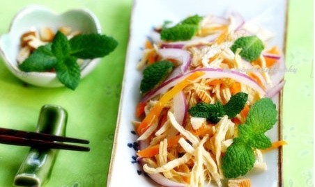 原料: 雞胸肉、薄荷葉、胡蘿卜、洋蔥、杏仁、米醋、糖、生抽、香油。 做法: 1、雞胸肉凈后,放入鍋中,加姜片,煮30分鐘, 煮的過程中如有浮沫要撇出; 2、在煮雞肉的同時(shí),將胡蘿卜洗凈切成絲,洋蔥切絲,薄荷葉洗凈撕成小片,杏仁切碎; 3、煮至雞肉快熟時(shí),將胡蘿卜絲倒入,一起煮約3分鐘后關(guān)火; 4、將煮好的雞肉和胡蘿卜絲分別撈出來,煮肉的雞湯可以作它用; 5、待雞肉晾涼一些,將肉撕成絲,然后將洋蔥絲、薄荷葉、胡蘿卜絲和杏仁碎與雞絲混合,澆上調(diào)料拌勻即可。 備注: 1、做好的雞絲,可以直接拌好當(dāng)涼菜吃,也可吃涼面時(shí)一起吃,味道都很好,非常適合炎熱的夏天。 2、調(diào)料可根據(jù)喜好自行調(diào)配,以清淡低油為宜。比如醋可以換成檸檬汁。 |