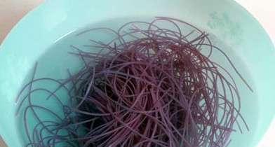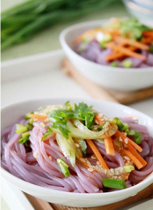 偶然間在超市的貨架上發(fā)現(xiàn)有賣紫薯粉條的,遂買了些回來。主要原因還是因為想起了紫薯做出的各式美味漂亮點心,紫色,充滿了魅惑。要說這美食,首先吸引人的恐怕還是這色,色彩賣相上占了上峰自然就會引誘著你去品嘗它的味道,喜歡了,還要品頭論足地說一說它的營養(yǎng)價值,而這道涼拌紫薯粉,也許能禁得住你的考驗! 涼拌紫薯粉,主要還是調(diào)好汁的味道,拌出來的口感與涼拌厥根粉差不多,是夏日里不可多得的一道小菜。