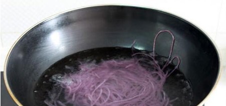 2、鍋中坐水,燒開,將紫薯粉下入鍋中煮爛,無硬心即可撈出過涼水備用;
