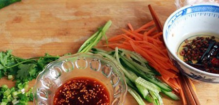 原料: 紅薯粉、黃瓜、胡蘿卜、鹽、雞精、糖、醋、生抽、辣椒油、白芝麻、花椒油、芝麻油、香蔥、香菜少量。 做法: 1、取適量紫薯粉放在涼水中浸泡30分鐘左右;