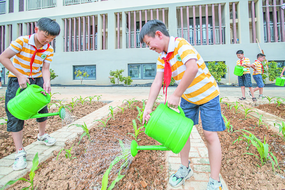 昨日,新學(xué)期第一天,佛堂鎮(zhèn)倍磊小學(xué)的80余名學(xué)生,在學(xué)校的勞動實(shí)踐基地種植蔬菜、為蔬菜澆水,體驗(yàn)別樣的“開學(xué)第一課”。 日前,教育部發(fā)布了《義務(wù)教育勞動課程標(biāo)準(zhǔn)(2022年版)》。從今年秋季開學(xué)起,勞動課將正式升級為中小學(xué)的一門獨(dú)立課程。為培養(yǎng)學(xué)生正確的勞動價(jià)值觀、良好的勞動品質(zhì)以及基礎(chǔ)的勞動技能,今年秋季開學(xué),倍磊小學(xué)把勞動實(shí)踐教育作為了開學(xué)第一課。 倍磊小學(xué)校長宋建軍介紹,倍磊小學(xué)全校18個(gè)班級,每個(gè)班級都有自己的種植場地。“從蔬菜種植、管理到采收,讓學(xué)生自己體驗(yàn)勞作的樂趣。” |