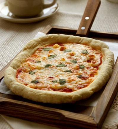 原料:高筋面粉50克、低筋面粉50克、鹽2克、酵母1克、水55ml、水煮番茄120克、馬蘇里拉80克、羅勒葉或薄荷葉2片、帕馬森奶酪粉5克、蒜香橄欖油1大勺、鹽少量。 做法: 1、將37度的溫水加入酵母粉里,攪勻; 2、把高筋粉和低筋粉、鹽混合加入酵母水; 3、邊加邊攪拌; 4、在盆里將面團揉成團,再放在案板上繼續(xù)揉; 5、大概揉4-5分鐘后,面團光滑,放在抹了橄欖油的盆里,18度環(huán)境下發(fā)酵8小時; 6、奶酪切5mm的小丁; 7、發(fā)酵好的面團用手整理成長方形,邊緣用手捏出厚度; 8、加熱平底鍋,把面團放入,烘烤至底部上色; 9、水煮番茄提前加鹽煮成濃稠狀態(tài),晾涼后加在比薩上; 10、再把奶酪丁、奶酪粉撒上,加一大勺蒜香橄欖油; 11、220度8-15分鐘。(如果你有烤爐,3分鐘左右即可; 12、撒羅勒葉或者薄荷葉裝飾。