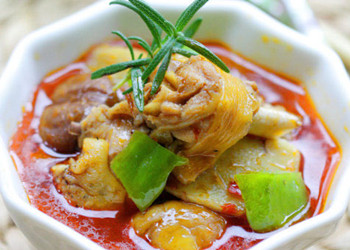 原料: 老雞半只、老姜100克、板栗20顆、郫縣豆瓣25克、生抽5ML、料酒10ML、糖5克、胡椒粉2克、干花椒5克、鹽3克、雞精3克、蔥花。 做法: 1、將雞切成3厘米見方的塊,放在清水中漂洗濾干備用; 2、鍋燒至7成熱后,加入色拉油,加入干花椒、郫縣豆瓣炒出香味;放入雞塊,大火炒到雞皮變成金黃色,直到雞油煸出; 3、加入掩蓋雞肉的開水; 4、放入姜塊、料酒大火煮開,然后轉(zhuǎn)成中火悶煮; 5、30分鐘后,放入板栗,蓋上蓋繼續(xù)中火悶煮; 6、悶至雞肉、板栗松軟的時候,開至大火收汁; 7、加入雞精、鹽、胡椒粉、生抽調(diào)味; 8、吃的時候撒上蔥花即可。 |