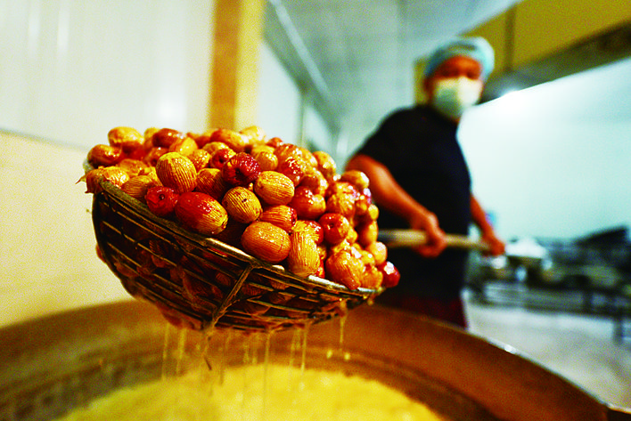 10月9日下午,義烏同心樂農(nóng)莊飄出陣陣棗香,不少市民正品嘗香甜四溢的蜜棗。在加工車間內(nèi),近10名工人佩戴口罩,有條不紊地進(jìn)行劃絲、清洗、糖煮、初烘、整形、回烘等各道工序。 “現(xiàn)在正是義烏大棗成熟收獲的季節(jié)。大部分棗被加工成蜜棗和南棗!蓖臉忿r(nóng)莊負(fù)責(zé)人駱紅衛(wèi)介紹,農(nóng)莊每天生產(chǎn)的蜜棗大約有2500公斤,一部分出口到馬來西亞、新加坡等國,一部分銷往省內(nèi)及廣東、福建等地。“今年的蜜棗、南棗質(zhì)量都不錯,銷售供不應(yīng)求。”