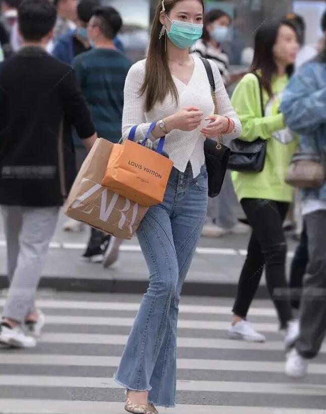 就比如這位小姐姐的牛仔喇叭褲就是設計得非常修身又時髦洋氣,搭配個性款白色針織小衫,把清新感與修身的效果,輕松地打造出來,充滿了年輕的活力與休閑。