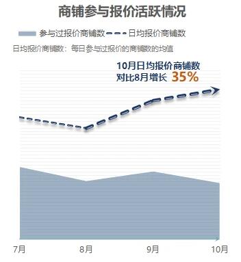 找取暖用品、節(jié)慶用品,還是得來義烏小商品城。 據(jù)統(tǒng)計,10月份犇犇找貨后臺共收集采購線索4.8萬余條;共有7000家采購商參與咨詢,5450家經(jīng)營戶響應(yīng)了報價2.11萬次,響應(yīng)率達44%。 【10月趨勢變化】 ❶市場報價活躍度明顯提高 截止10月底,“義烏進貨節(jié)活動”圓滿落幕,活動期間,市場經(jīng)營戶們積極報價響應(yīng)活動。據(jù)統(tǒng)計,10月日均參與報價商鋪數(shù)對比8月增長35%,商鋪報價活躍度提高的同時增強了犇犇找貨產(chǎn)品與市場經(jīng)營戶的互動性。
