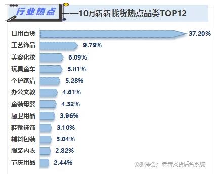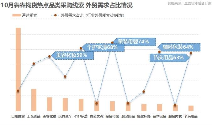 ❸節(jié)慶用品到了熱銷旺季 節(jié)慶用品、輔料包裝成為本月市場商鋪響應(yīng)最積極的外貿(mào)熱點。 據(jù)后臺統(tǒng)計,犇犇找貨10月的外貿(mào)大貨需求占比達32%。在找貨熱點品類中,童裝母嬰、個護家清、輔料包裝、節(jié)慶用品、美容化妝五大品類成為本月的外貿(mào)熱品。