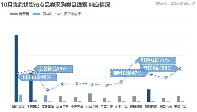 在犇犇找貨10月收集的熱點品類采購線索線索中,市場商鋪對日用百貨、工藝飾品、服裝輔料的查看量最高,對鞋靴襪飾、節(jié)慶用品、工藝飾品、日用百貨、輔料包裝五大品類線索的報價響應(yīng)率最高。