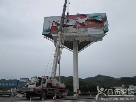 近日,大陳鎮(zhèn)103省道義烏超限運(yùn)輸檢測(cè)站附近,十幾個(gè)工人正在對(duì)一處高約20米、寬約10米、中心柱直徑約1米的高炮廣告牌進(jìn)行拆除。執(zhí)法局大陳大隊(duì)執(zhí)法隊(duì)員介紹,由于高炮廣告牌成本非常高,執(zhí)法人員在前期也 ...