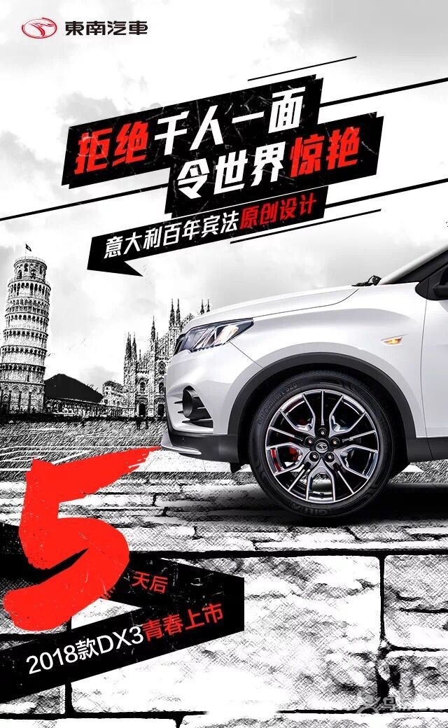 距離2018款DX3上市,還剩5天! 依托東南汽車22年原創(chuàng)真實力 借助意大利百年賓法原創(chuàng)設(shè)計 打造更具SUV野性氣息的車型 咨詢電話:0579-85513030 購車地址:義烏東南三菱4S店(經(jīng)發(fā)大道205號)