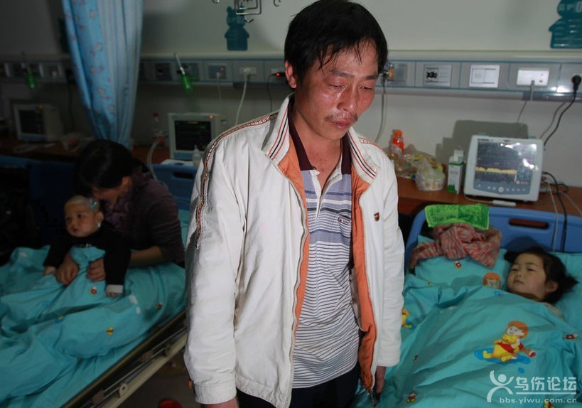 治療要花10萬(wàn)元 父親一籌莫展 孩子的父親欲哭無(wú)淚,他的左邊是8個(gè)月大的小兒子李順仕,右邊是5歲的二女兒李水秀。 李合元穿著一雙仿彪馬的運(yùn)動(dòng)鞋,白色的運(yùn)動(dòng)衣到處都是褶皺,頭發(fā)也有些凌亂。他已經(jīng)兩頓都沒(méi)吃飯了,滿腦袋想的都是醫(yī)療費(fèi)。孩子和妻子因?yàn)橹卸,都得進(jìn)行血液透析等治療,“加起來(lái),費(fèi)用要10多萬(wàn)! 他28日下午匆匆趕回大竹老家借錢(qián),但左鄰右舍都才買(mǎi)了種子、農(nóng)藥,經(jīng)濟(jì)都不寬裕,借了10多家,才湊到400元錢(qián)。但他又擔(dān)心孩子和妻子的病情,想盡快趕回重慶,“他和嫂子、鄰居又花300元包了一輛面包車(chē)。” 錢(qián)沒(méi)有借到,李合元很郁悶。他感覺(jué)這個(gè)原本幸福的家庭,就要散了。特別是說(shuō)到兩個(gè)女兒在電話里喊他注意身體,小兒子牙牙學(xué)語(yǔ)的樣子,他已經(jīng)聲淚俱下。 29日上午,重醫(yī)附屬兒童醫(yī)院腎臟免疫科病房?jī)?nèi),住著三姐弟,三個(gè)孩子正在接受血液凈化治療。大姐不斷地低聲哭喊痛,年僅8個(gè)月的老三,在夢(mèng)中還著嘴。也許他們至今不解,為啥平時(shí)這么疼自己的母親,會(huì)灌自己喝下農(nóng)藥? 與此同時(shí),喝下農(nóng)藥的母親唐成芳,正在重醫(yī)附一院呼吸內(nèi)科重癥監(jiān)護(hù)室進(jìn)行治療,還有兩名警察緊隨左右。 |