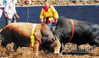 10月1日,“慶國(guó)慶、賀豐收”傳統(tǒng)斗牛大賽在義烏市鳴鑼開(kāi)賽,16頭彪悍善斗的黃牯牛輪番上陣,讓中外游客大飽眼福。